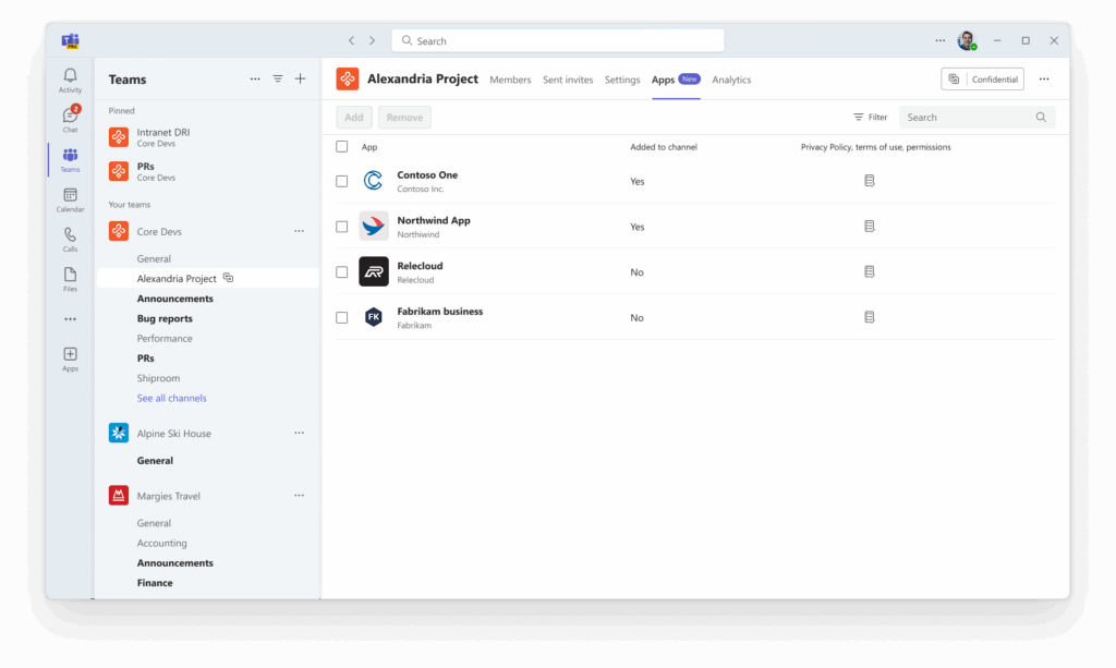 Previously, only a limited set of tabs were available in Shared Channels. Now, a wide range of apps can be added, provided they’re updated by developers to support Shared Channel functionality and allowed by admins.  This model will extend to Private Channels soon too.